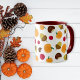 This coffee mug features a colorful autumn harvest pattern with pumpkins, cranberries, acorns, and chestnuts on a white background. Great gift for fall and Thanksgiving!