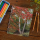 A personal sized, spiral bound notebook that features a photo image of beautiful birches and colorful, autumn maple leaves along a garden path. Leaf color is primarily shades of orange. You may customize your notebook cover to add text if desired. Use as a journal or to keep important notes.