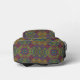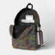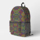 Colorful backpack with front view showing vibrant geometric patterns in reds, blues, and greens. Back view reveals black straps and padded design.