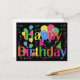 Colorful happy birthday blank postcards. Balloons in different vibrant colors with stars, confetti and party hats. Black background. Customize by adding your handwritten note.