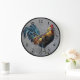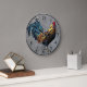 A colorful painting of a bantam rooster on a grey granite background. This rooster has exotic and colorful feather patterns. A bright red comb and a beautiful tail made of blue feathers.