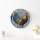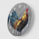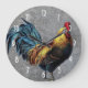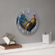 A colorful painting of a bantam rooster on a grey granite background. This rooster has exotic and colorful feather patterns. A bright red comb and a beautiful tail made of blue feathers.