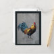 A colorful painting of a bantam rooster on a grey granite background. This rooster has exotic and colorful feather patterns. A bright red comb and a beautiful tail made of blue feathers.