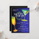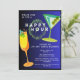 Here's a simple, yet colorful invitation for any upcoming happy hour! Large drinks enhance the design with bold white font on a dark blue and black gradient background. There's also a sketch of a clock behind the words "Happy Hour" for an artistic look. Easy to identify hosts or event title and name, along with all of your particulars. Looks great sent digitally as well.