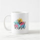 This cute coffee mug features a whimsical heart and a colorful paint splash in shades of blue, yellow, pink and green along with trendy text that reads: be kind.