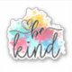 This cute custom-cut sticker features a whimsical heart and a colorful paint splash in shades of blue, yellow, pink and green along with trendy text that reads: be kind. Spread some positivity with this cute inspirational sticker when you place it on a notebook, folder, laptop, water bottle or more.