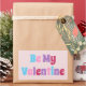 "Be my Valentine" features a colorful sticker with the letters written in light blue, pink and purple. The background color is a light pink. Customize as you like.