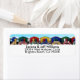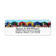A row of multicolor beach homes or huts on a white sand beach. Personalize these summer theme labels with your name and address.