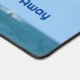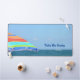 Bright colorful beach umbrella against tropical sea with an approaching boat, says it all on this fun escapism sky blue desk mat, Take Me Away! A sunny Oceanview of your very own. Text may be personalized with a Name or your own text.