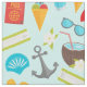 Graphics of beach vacation elements on a bright blue background, seamless repeat pattern