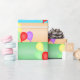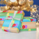 Bright and colorful wrapping paper with a birthday design of yellow, green, purple and red balloons on a multi-colored background.