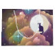 Sunset colors the surreal looking clouds in the sky in blue, purple, pink and yellow in this cute outer space illustration. A black cat sits on the crescent moon gazing out at the stars with fascination. Will she reach and try to grab one?