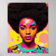 This pop art style artwork features a beautiful black woman with a large afro, 70s aesthetic with some flower power and hoop earrings. A vibrant melanin beauty with natural hair in a bold, multicolor digital art piece. Cyan, magenta pink, and yellow color scheme with some peach.