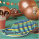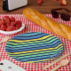 Paper plates featuring a colorful blue green and yellow stripes pattern. These plates are great for any celebrations.