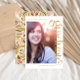 This beautiful graduation announcement features a colorful boho print with modern graduate type and one photo.