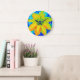 A beautiful bright colorful clematis flower of yellow, orange and green against a vibrant background of aqua and blue adorns this floral acrylic wall clock. This image is digitally manipulated original photography by JLW_PHOTOGRAPHY.