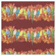 A beautiful drawing of a line of perching budgies with tropical red leaves behind.