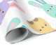 White wrapping paper with a pattern of bunnies in blue, yellow, pink, mint green, and purple.