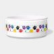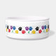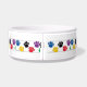 Cartoon dog with colorful dog paws all around. A fun water or food dish for your beloved dog. A cute pet accessory.