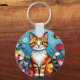 A sweet personalized key chain with a cute illustration of a colorful abstract cat surrounded by flowers, butterflies and the sun in a paper quilling impasto style.