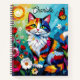 A sweet personalized notebook with a cute illustration of a colorful abstract cat surrounded by flowers, butterflies and the sun in a paper quilling impasto style.