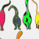 A colorful pattern, of six cats showing off their cute butts. Done in the 1960s pop art style.