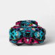 colorful and chaotic pattern of skulls. The skulls are mostly blue with various shades of pink and purple splatters and drips. Some of the skulls have cracked teeth and broken bones, adding to the gruesome and macabre nature of the image. The background is black, which helps to highlight the skulls and make the colors pop.