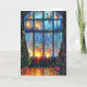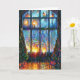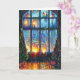 Colorful Christmas card with a painting of a large window and candle lights. The inside of the card is blank for personalized greeting.