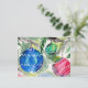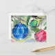 traditional watercolor artwork of a colorful ensemble of christmas tree ornaments in green, blue and red colors on a postcard.