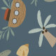 Nautical wallpaper for nurseries and kids rooms featuring whales, sharks, palm trees, boats, crabs, and fish scattered and tossed about. Shades of blue, red, yellow, green, and brown, over a dark navy blue background, fill this sea life inspired wallpaper for kids.