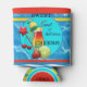 Can cooler featuring a colorful design with a cocktail and fruits on a striped background with pool image.