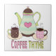 Colorful fun graphics of a coffee pot and two coffee cups. Graphic text at the bottom reads, COFFEE THYME. Great framed for your kitchen as a trivet.