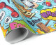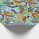 Colorful comic book graphics with speech bubbles on blue background, seamless repeat pattern