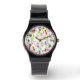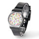 A fun colorful watch face adorned with a festive party atmosphere colorful confetti toss over white. The black numbers are a template which you can remove/clear. Pick your watchband "Style" and "Color" under Options.