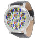 This men's watch has a mid-century modern design of a grid with colored squares and rectangles. It also has colored circles placed on the grid lines. If you like the design but prefer different colors, message me.