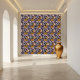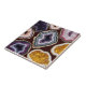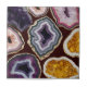 This tile pattern features a vibrant and eye-catching design of sliced geodes, showcasing a variety of natural crystal formations in hues of purple, pink, and gold. The intricate details and textures of the geodes, combined with a touch of golden accents, create a luxurious and modern aesthetic. Perfect for adding a unique and sophisticated touch to any space.