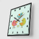 A clock with a trio of cute and whimsical hand-drawn birds. 2 of the birds are standing together with some tiny green pine trees in between their feet. Another blue bird is flying up in the air between them.
