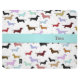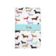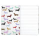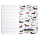 A wonderful journal for any dog lover, young or old. It features a white background with colorful little cartoon dachshunds all over it. It has a graphic of a blue ribbon running through the center for your name.
