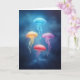 A mesmerizing scene featuring four vibrant jellyfish, each in a different shade—blue, orange, pink, and purple—floating gracefully through the deep ocean. The jellyfish's translucent bodies glow softly against the dark backdrop, while their long, flowing tentacles trail behind them, creating a magical and dreamlike effect. Surrounding bubbles and gentle swirls of water enhance the ethereal beauty of this underwater spectacle, making it feel like a peaceful journey through the mystical ocean.