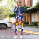 The dainty interlinked rosette design at the waist is truly unique. The poly-spandex makes for a nice fit and available in sizes 0-16. The printing is vibrant and eye-catching.