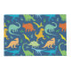 Colorful Dinosaur silhouette pattern. Tyrannosaurus Rex, titanosaurs, Triceratop, raptors, Ankylosaurs, Dino-Birds, Stegosaurus, Apatosaurus, Pteranodon and more in a colorful pattern in blue background, and dinosaurs in green, blue, yellow and orange.