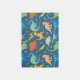 Dinosaur silhouette pattern. Tyrannosaurus Rex, titanosaurs, Triceratop, raptors, Ankylosaurs, Dino-Birds, Stegosaurus, Apatosaurus, Pteranodon and more in a colorful pattern in blue background, and dinosaurs in green, blue, yellow and orange.