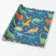 Colorful Dinosaur silhouette pattern. Tyrannosaurus Rex, titanosaurs, Triceratop, raptors, Ankylosaurs, Dino-Birds, Stegosaurus, Apatosaurus, Pteranodon and more in a colorful pattern in blue background, and dinosaurs in green, blue, yellow and orange.