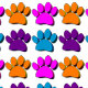 Cute cartoon style dog paw print pattern with 3D effect applied to the image. Paws in pink, blue, purple and orange.