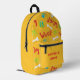 The design includes cute, colorful dog paw prints, white bones, and green tennis balls on a yellow background. The perfect backpack for your dog