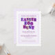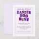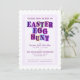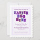 Colorful invitation with each letter of "Easter Egg Hunt" on it's own color background pennant or swatch, set within a speckled purple border with the same speckled purple pattern covering the back of the card.