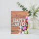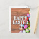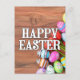 This vibrant postcard features various colorful Easter eggs and a few freshly picked tulip flowers.
