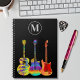 Three cool guitar designs with Fire flame pattern Electric guitar, multicolored semi acoustic guitar and psychedelic classic acoustic guitar art illustration with personalized orange and black monogram. This easy to use template creates the perfect gift for a guitarist, musician and music lovers. Any guitar player will tell you that you can never have to many guitars. This cool modern musical instrument design celebrates the music energy of this wonderful musical instrument. Original artwork by artist Catherine Sweetman