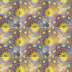 A bright and colorful ornamental tile design with a medallion pattern composed of geometric forms in orange, yellow, and blue.