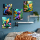 Set of 4 different paintings featuring colorful dragon or fantasy dinosaurs. Nice to brighten up a child's bedroom and as a gift for a child with a vivid imagination or loving adventure.
